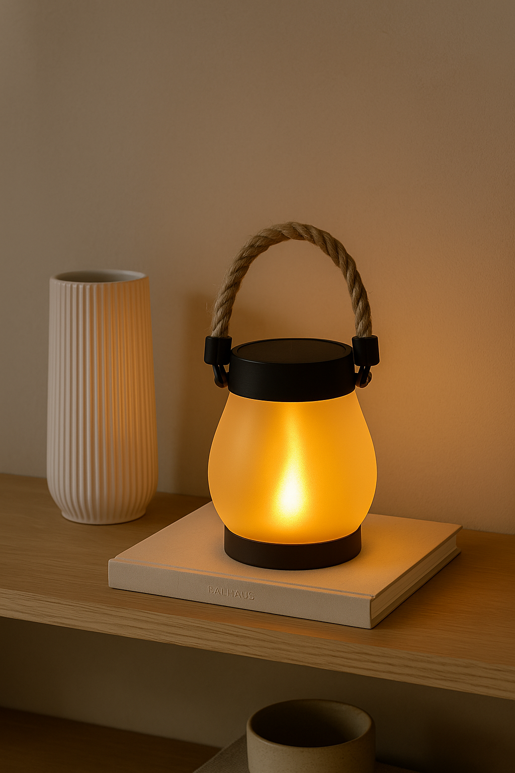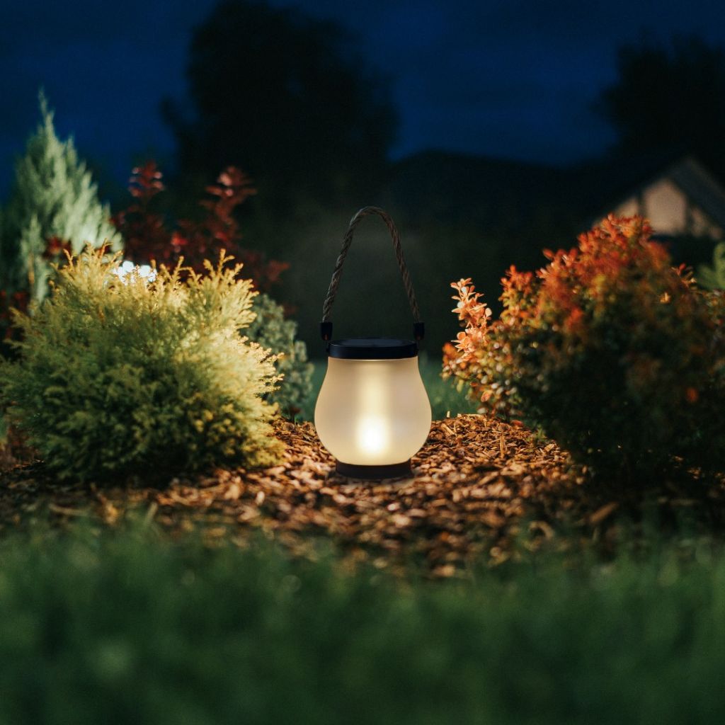 Lyktan kan hängas upp i det medföljande hamparepet eller ställas direkt på bord, altan eller mark.
